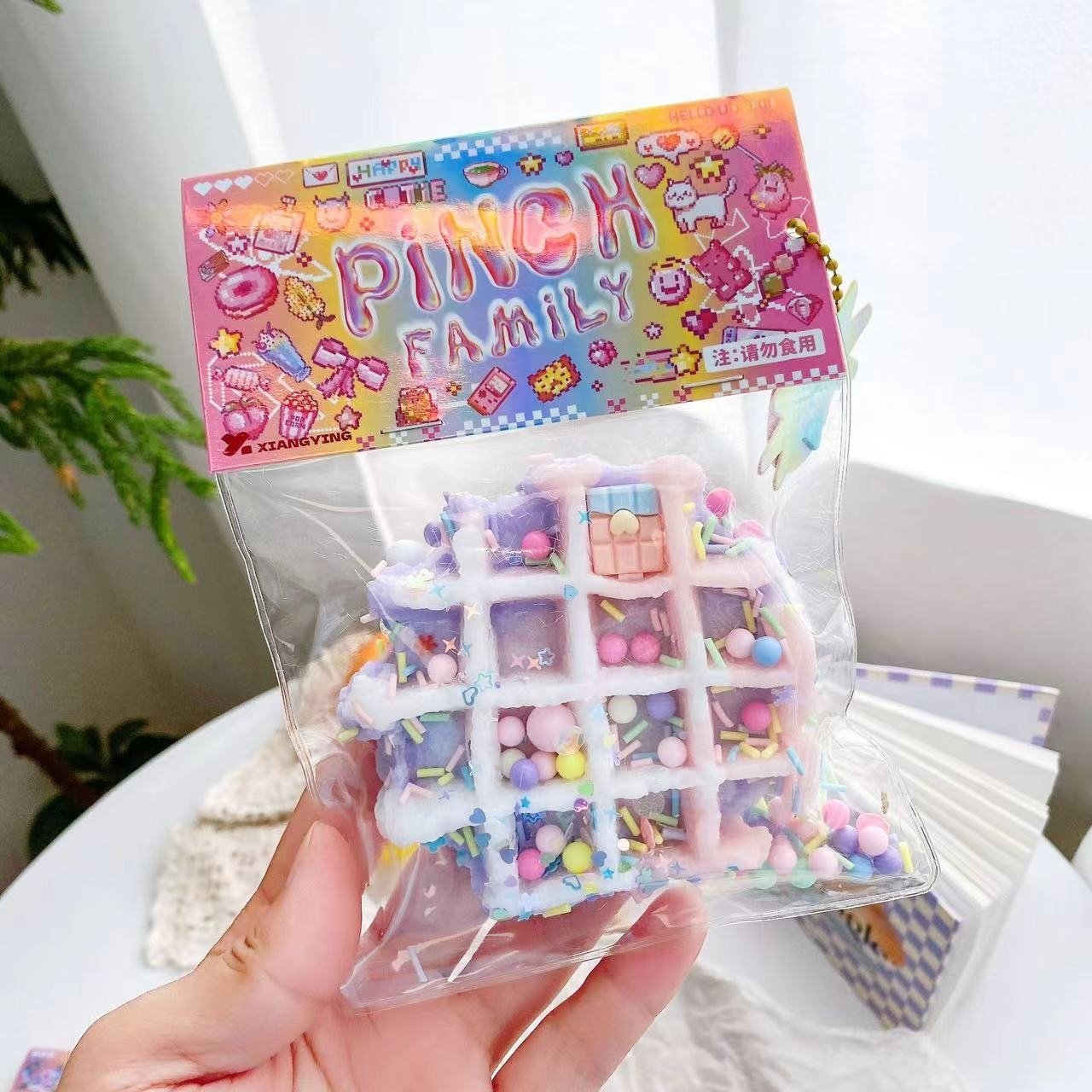 Delicious waffle shape, full of fun and creativity. The surface of the waffle is covered with pink frosting and colorful small particles, with realistic details, just like a freshly baked dessert. The texture is soft and feels comfortable when pinched, suitable for relieving stress and anxiety. It has good elasticity and can rebound quickly after pinching, providing a long-term decompression effect.